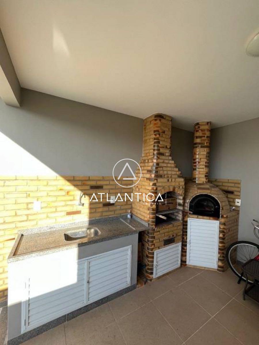 Na área externa, um espaço pensado para convivência, com churrasqueira, forno de pizza e bancada com pia.