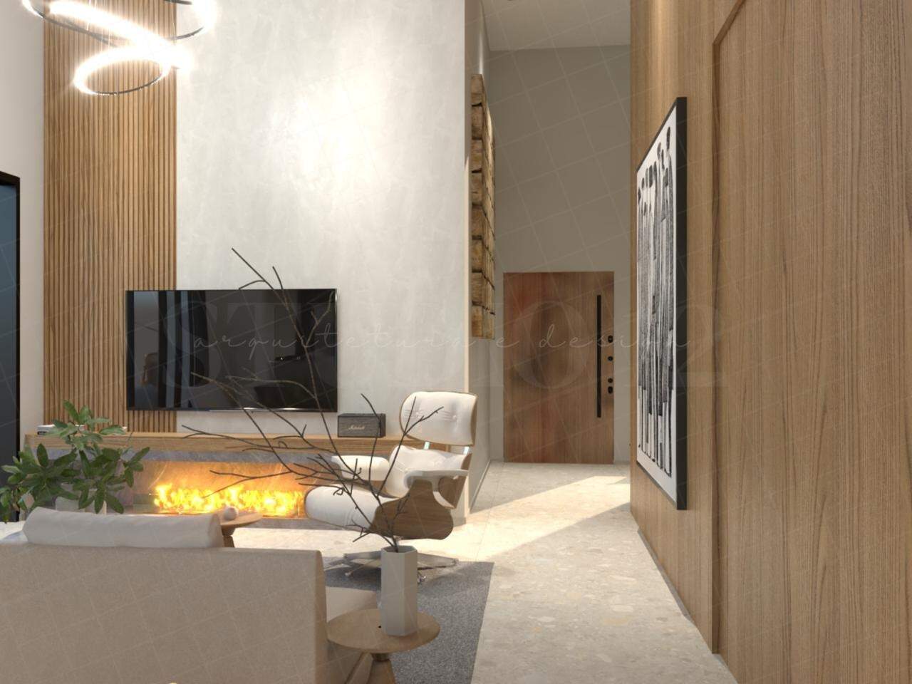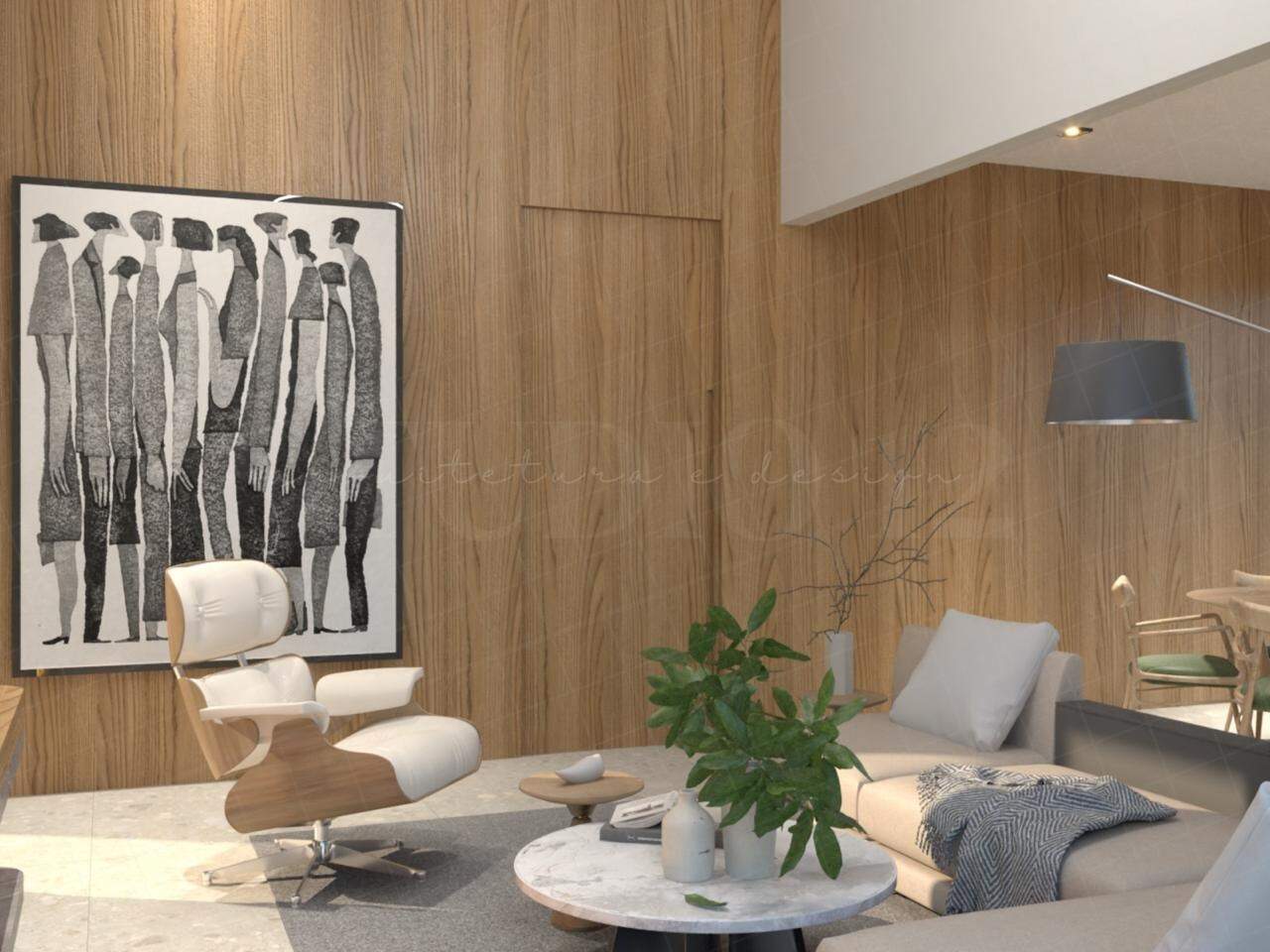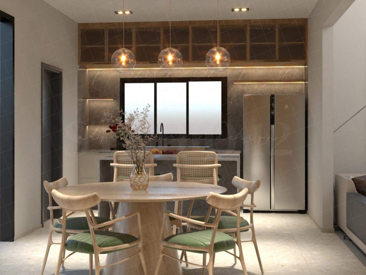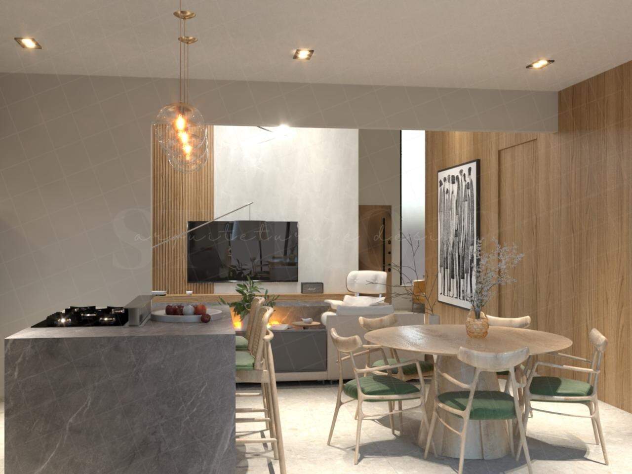 sala em dois ambientes com pé direito alto, cozinha conceito aberto, lavabo, área de serviço, despensa e garagem coberta para 02 carros.