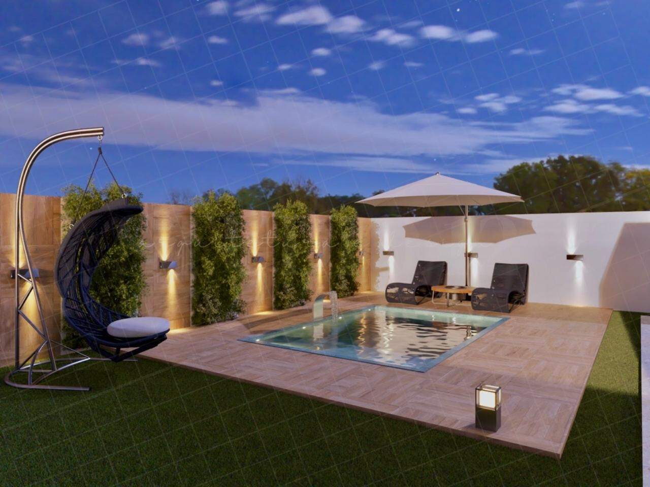 Área gourmet com churrasqueira, área livre com jardim e piscina.