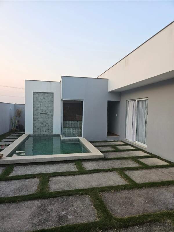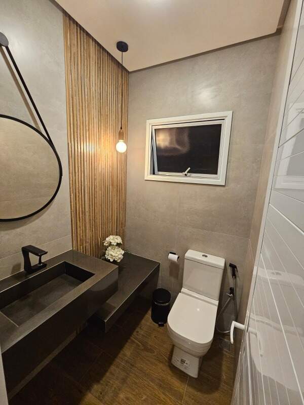 Casa com 214 m² de área construída, 3 quartos (1 suíte), banheiro interno e lavabo externo.