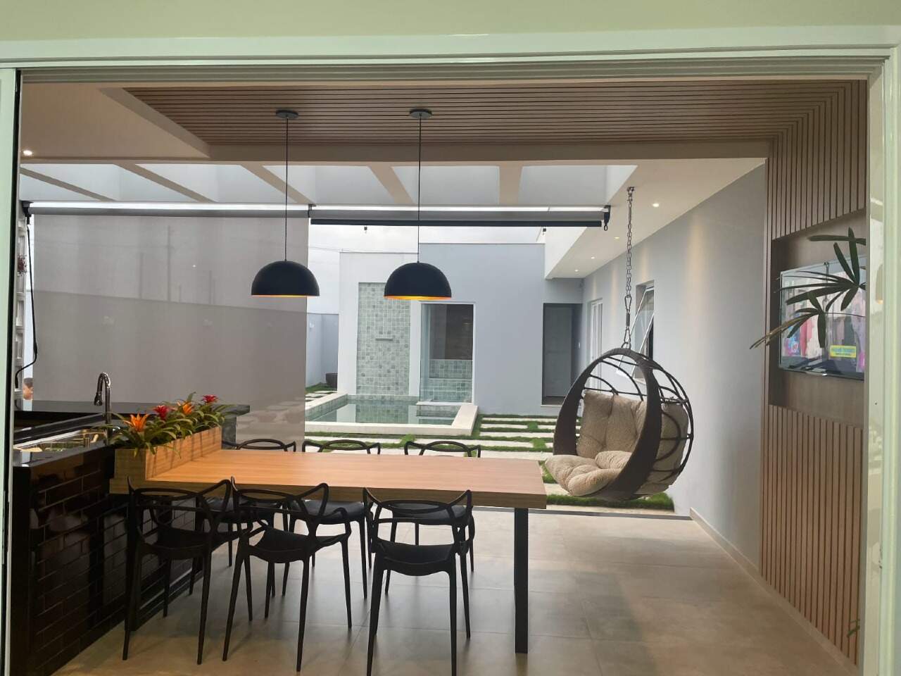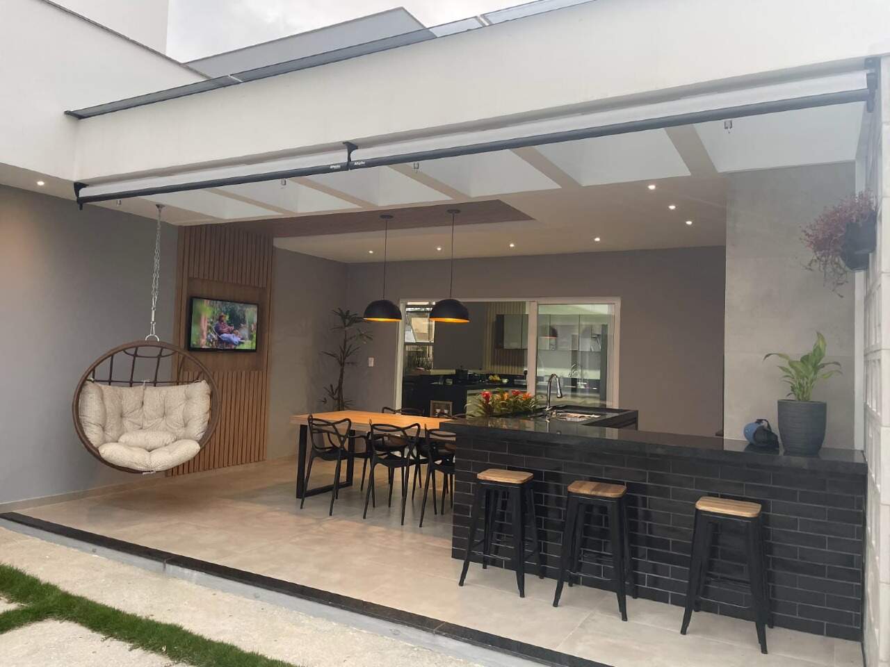 Ambientes integrados na sala, cozinha, área de jantar e espaço gourmet.